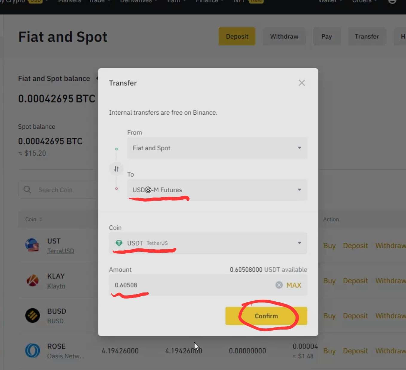 Coin에 USDT 선택 후 amount에 옮길 수량 입력후 Confirm 눌러주시면 준비 완료입니다