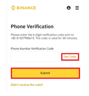 Get Code 클릭 > 문자 인증번호 입력 > Submit